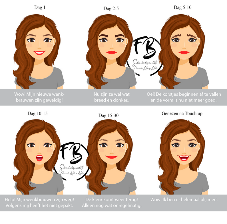 30 minuten na de behandeling dient u de wenkbrauwen te wassen met een neutrale gekookt en gekoeld water, raak de huid (rondom) de wenkbrauwen niet aan met uw handen, doe dit met wattenschijfje. Op uw handen leven bacterien, welke de kans op een infectie vergroten. Dep de wenkbrauwen droog met een nieuw wattenschijfje. Breng hierna via en schoon wattnstaafje een dun laagje verzorgende creme aan welke u van uw specialist meegekregen heeft. Herhaal deze behandeling 3 keer per dag . Als de behandeling laat in de middag of in de avond plaats vind, voert u vóór het slapen de bovengenoemde handeling uit.